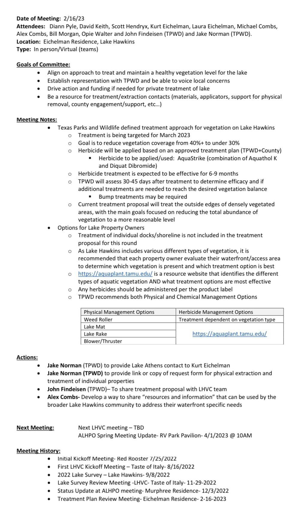 Hey everyone, I just wanted to share an update that we had our first Lake Hawkins Vegetation Committee meeting on 8/16. Below you will find the meeting minutes. We want to be very transparent with the efforts of the group and drive towards a balanced vegetation level for the lake. We are working with the assigned TPWD contact closely and will engage with Wood County as needed as well. Big thanks to those participating with and supporting this effort!